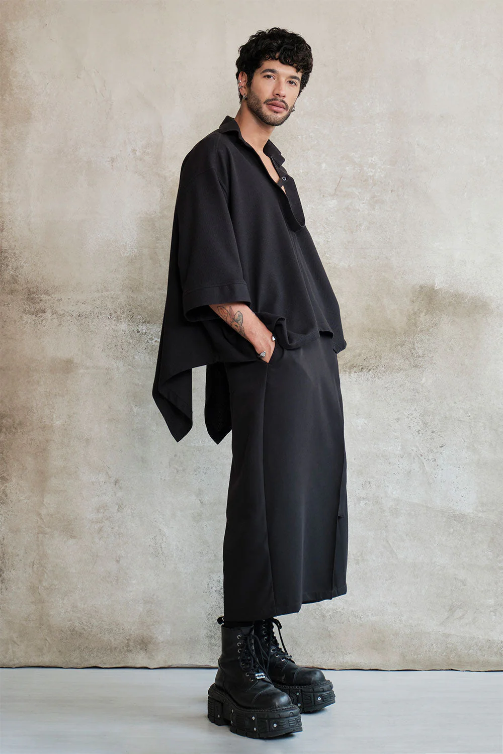 Featuring a batwing sleeve design and pointed collar, this oversized blouson in black textured knit offers a structured drape and an enveloping feel. Its wide, flowing cut redefines style with an effortlessly bold silhouette. Perfect for standing out with attitude.