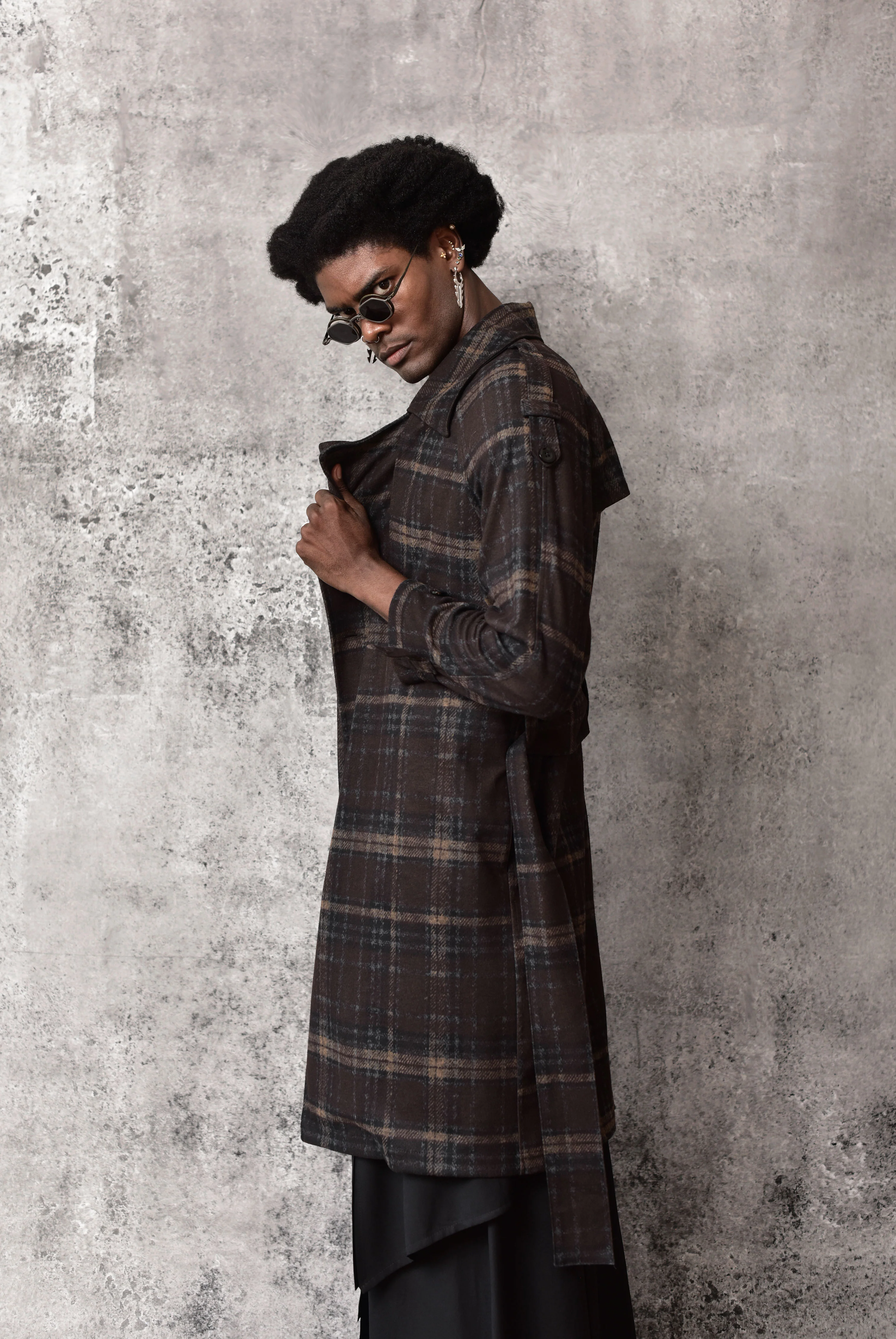 Long plaid corduroy coat with a clean, structured cut that balances elegance and attitude. Layered panels add visual depth, while the two-meter belt allows the silhouette to be transformed through styling.
